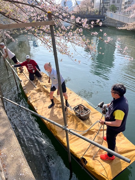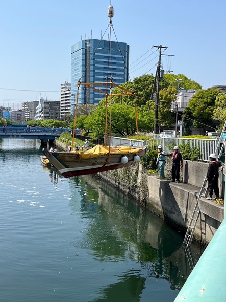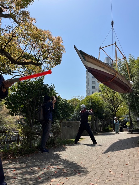 On the way, we lifted it up with a crane, loaded it onto a large truck, and unloaded it at Yokojukengawa Shinsui Park.