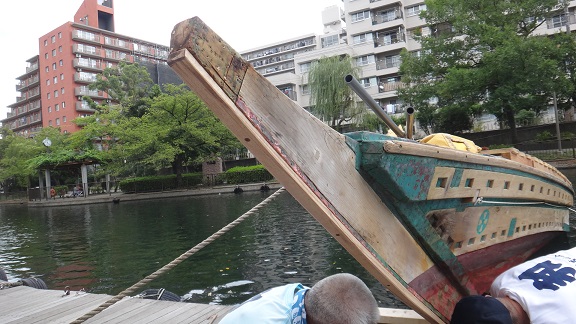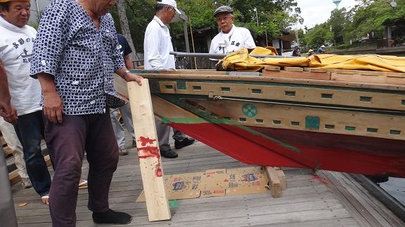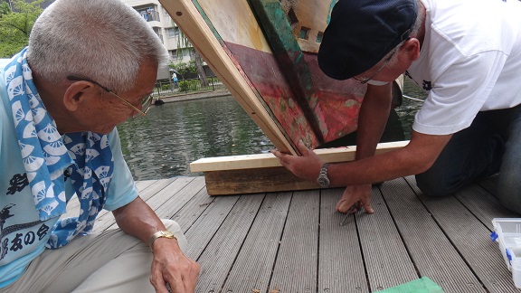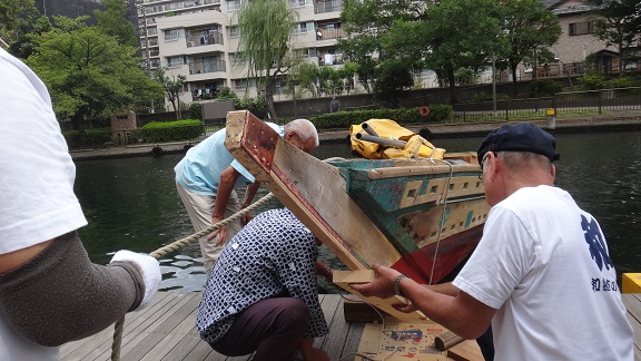 - 修理が完了していよいよ進水です。 修理したところが傷つかないよう注意します。