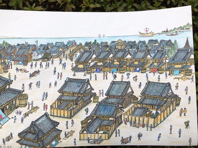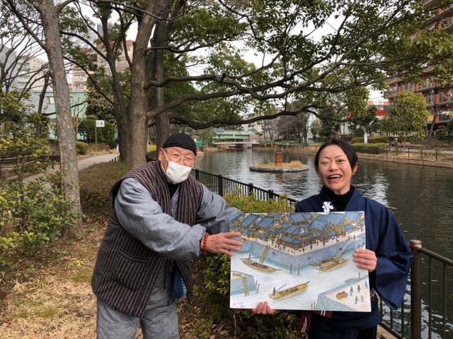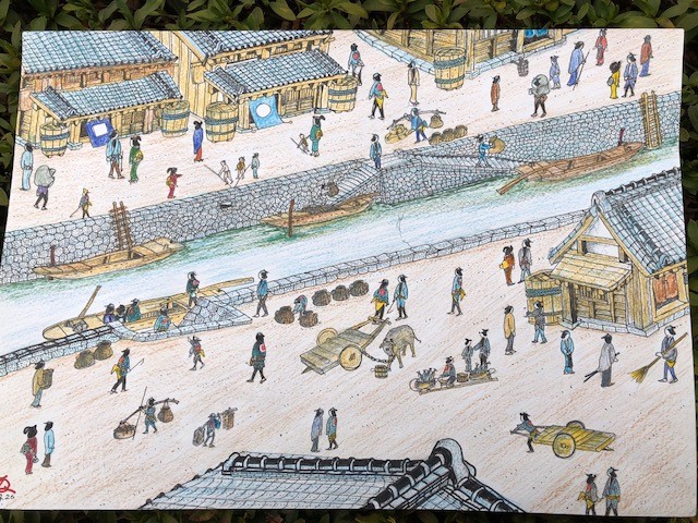 ご近所にお住まいで、趣味で絵を描いておられる方が和船をスケッチしていたのでお声を掛けたら素晴らしい絵を多数お持ちで、詳しく伺うと横十間川や仙台堀川周辺の江戸時代の様子を想像で描かれているとのことでした。