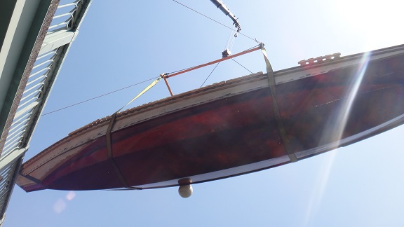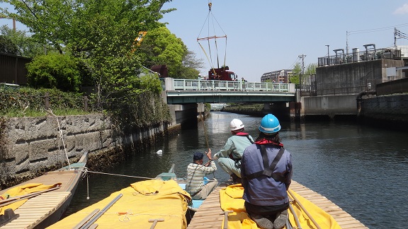 大横橋で待機しているクレーンで船を釣り上げトラックに載せて尾高まで陸送。