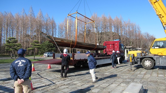 帰りもクレーンで吊り上げトラックに載せ海砂桟橋へ戻りました。